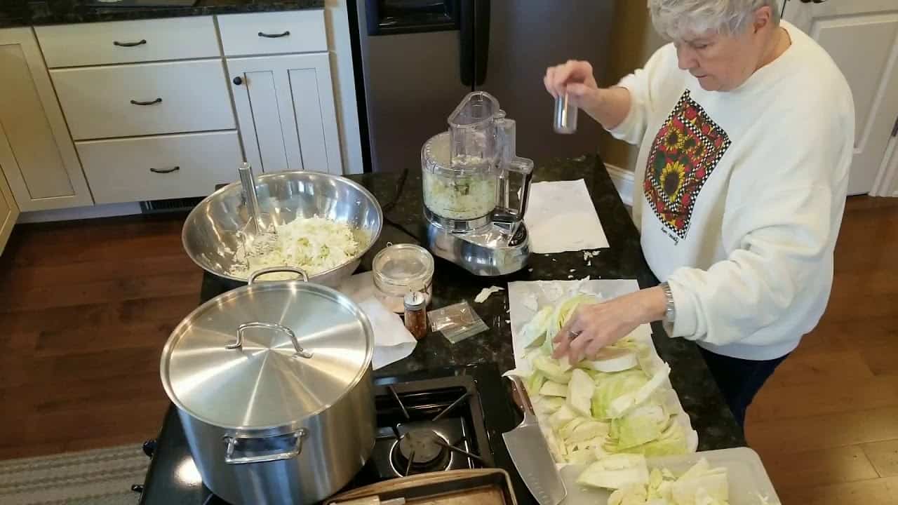 Making a gallon of Sauerkraut with mom. 15 flakes of crushed red pepper per half gallon give it just a little kick.